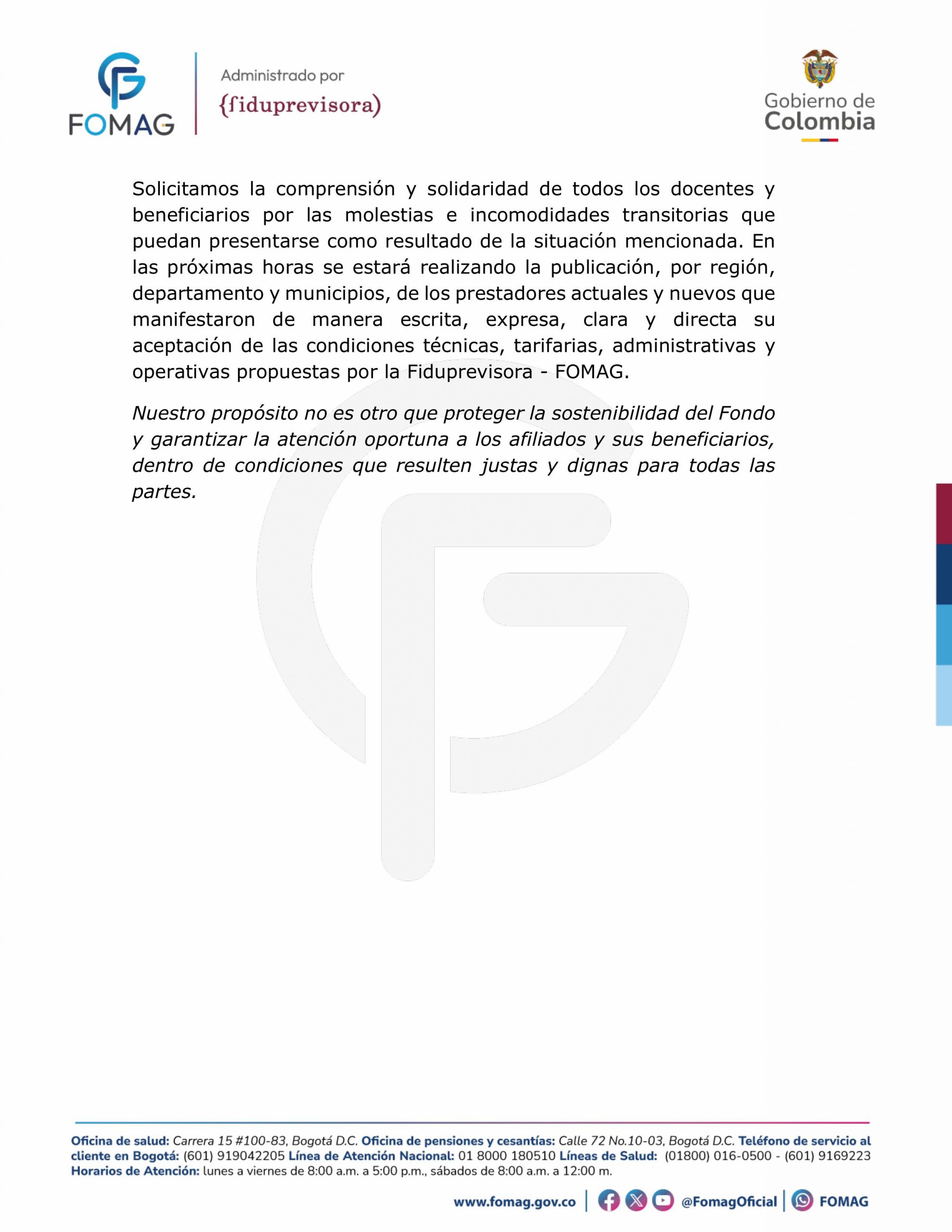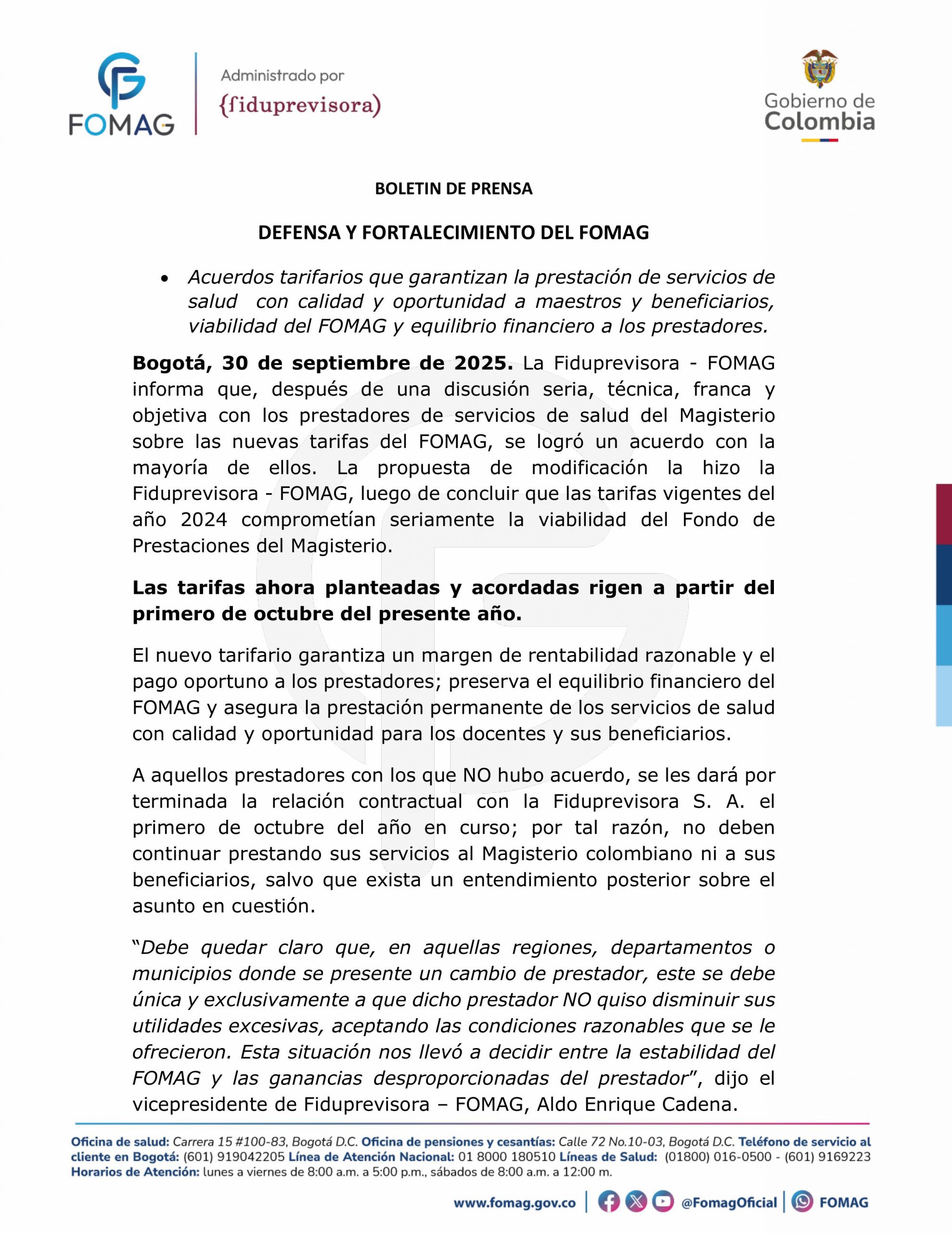 El nuevo tarifario garantiza un margen de rentabilidad razonable y el pago oportuno a los prestadores; preserva el equilibrio financiero del FOMAG y asegura la prestación permanente de los servicios de salud con calidad y oportunidad para los docentes y sus beneficiarios.