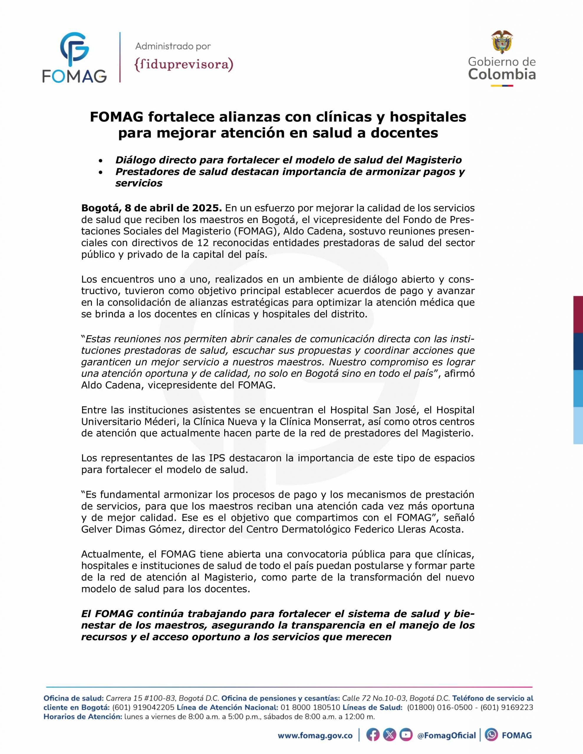 FOMAG fortalece alianzas con clínicas y hospitales para mejorar atención en salud a docentes
