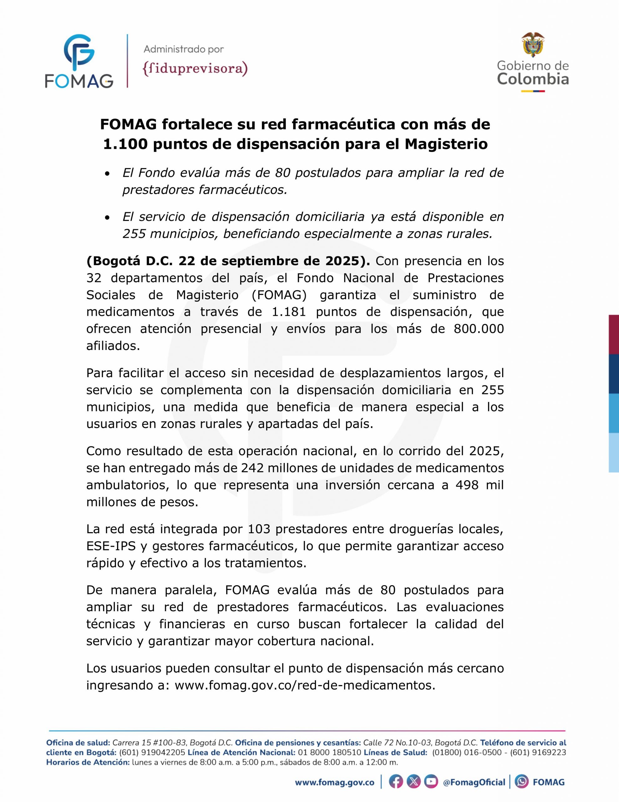 FOMAG fortalece su red farmacéutica con más de 1.100 puntos de dispensación para el Magisterio