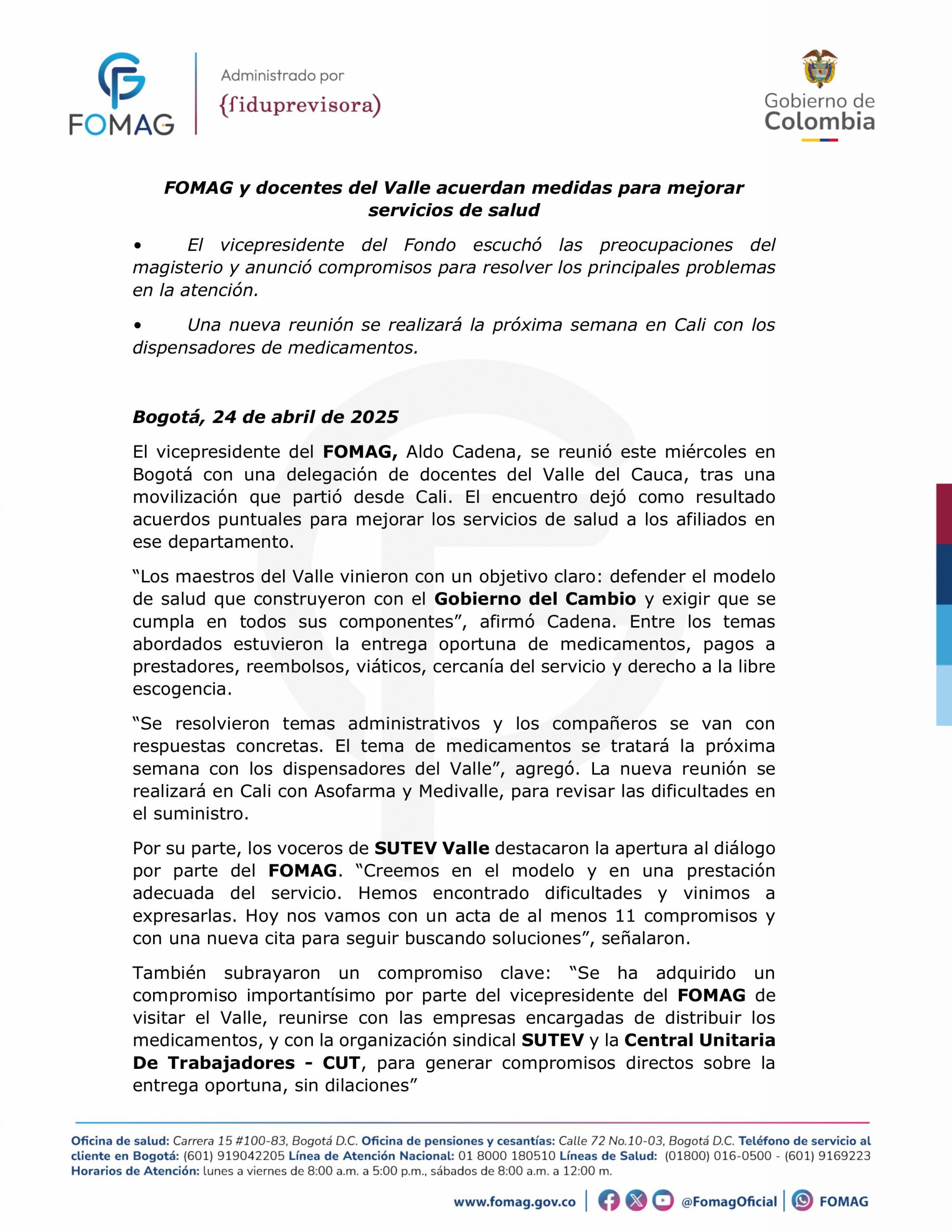 FOMAG y docentes del Valle acuerdan medidas para mejorar servicios de salud