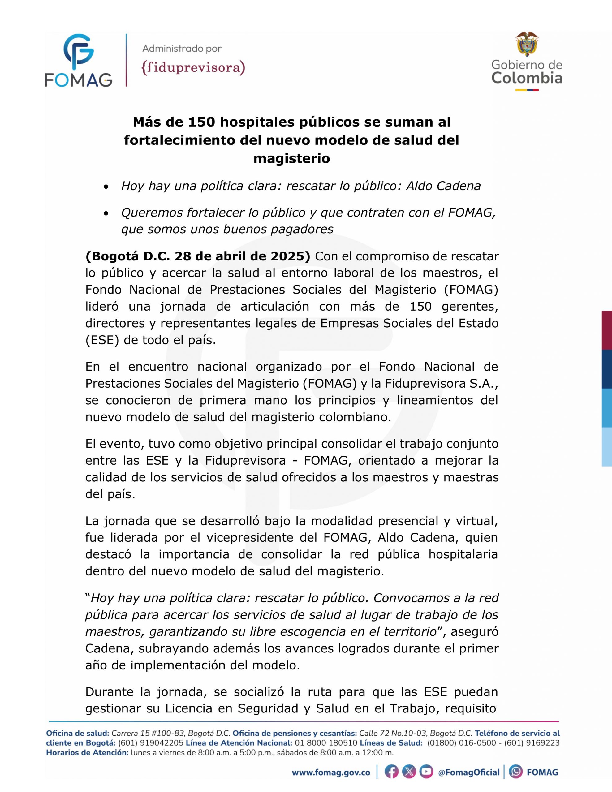 Más de 150 hospitales públicos se suman al fortalecimiento del nuevo modelo de salud del magisterio